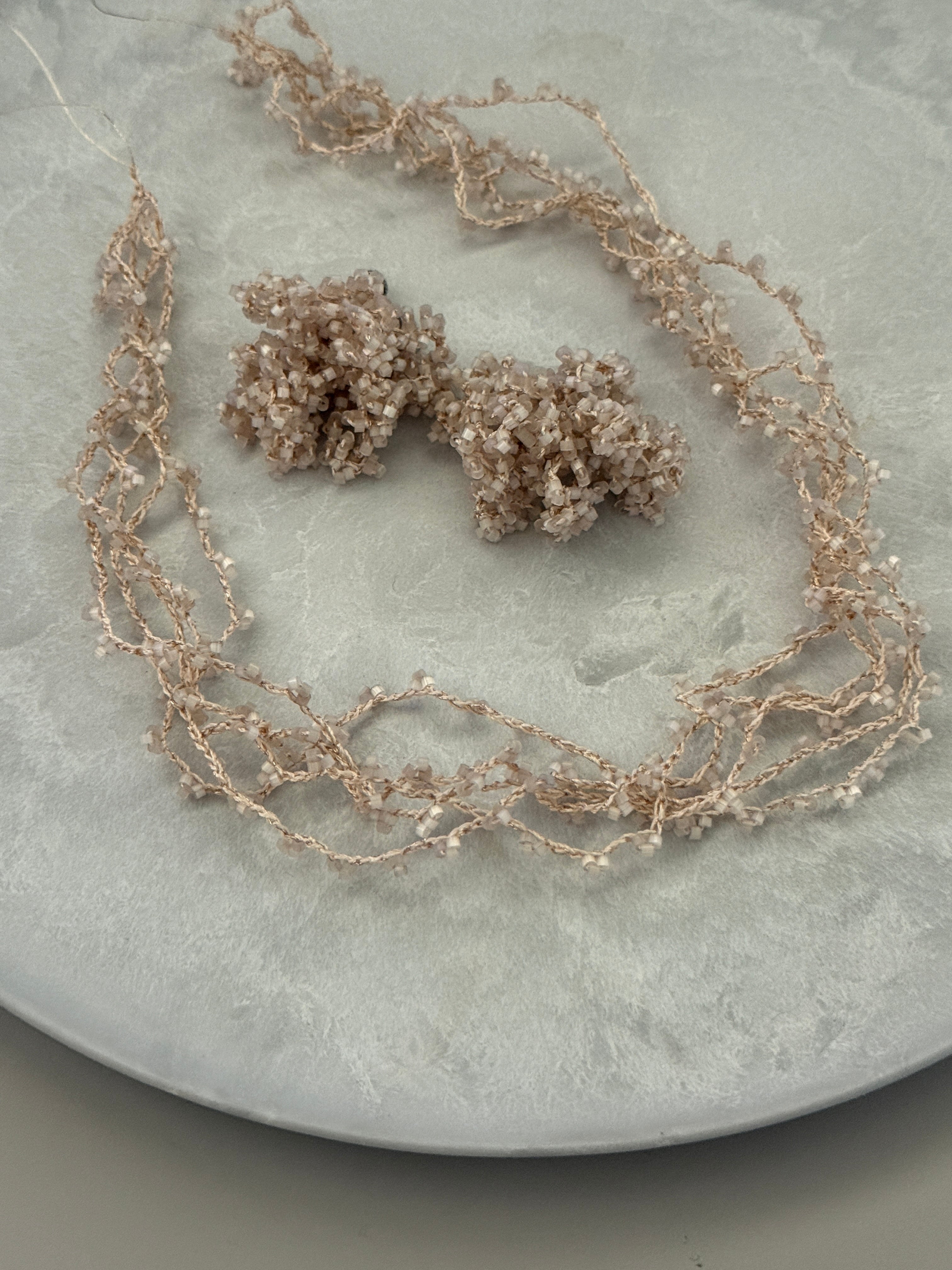 小さなビーズをシルク糸にあらかじめ通し、レース針で編む「ビーズクロッシェ」という技法でお作りしています
