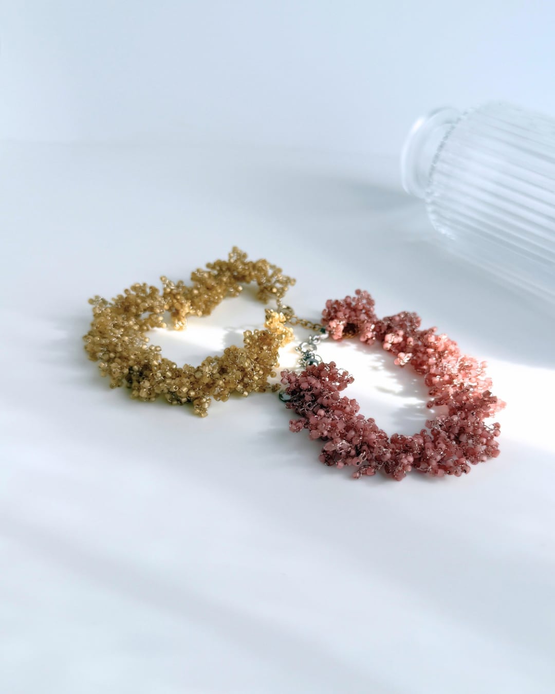 小さなビーズを極細のラメ糸にあらかじめ通し、レース針で編む「ビーズクロッシェ」という技法でお作りしています